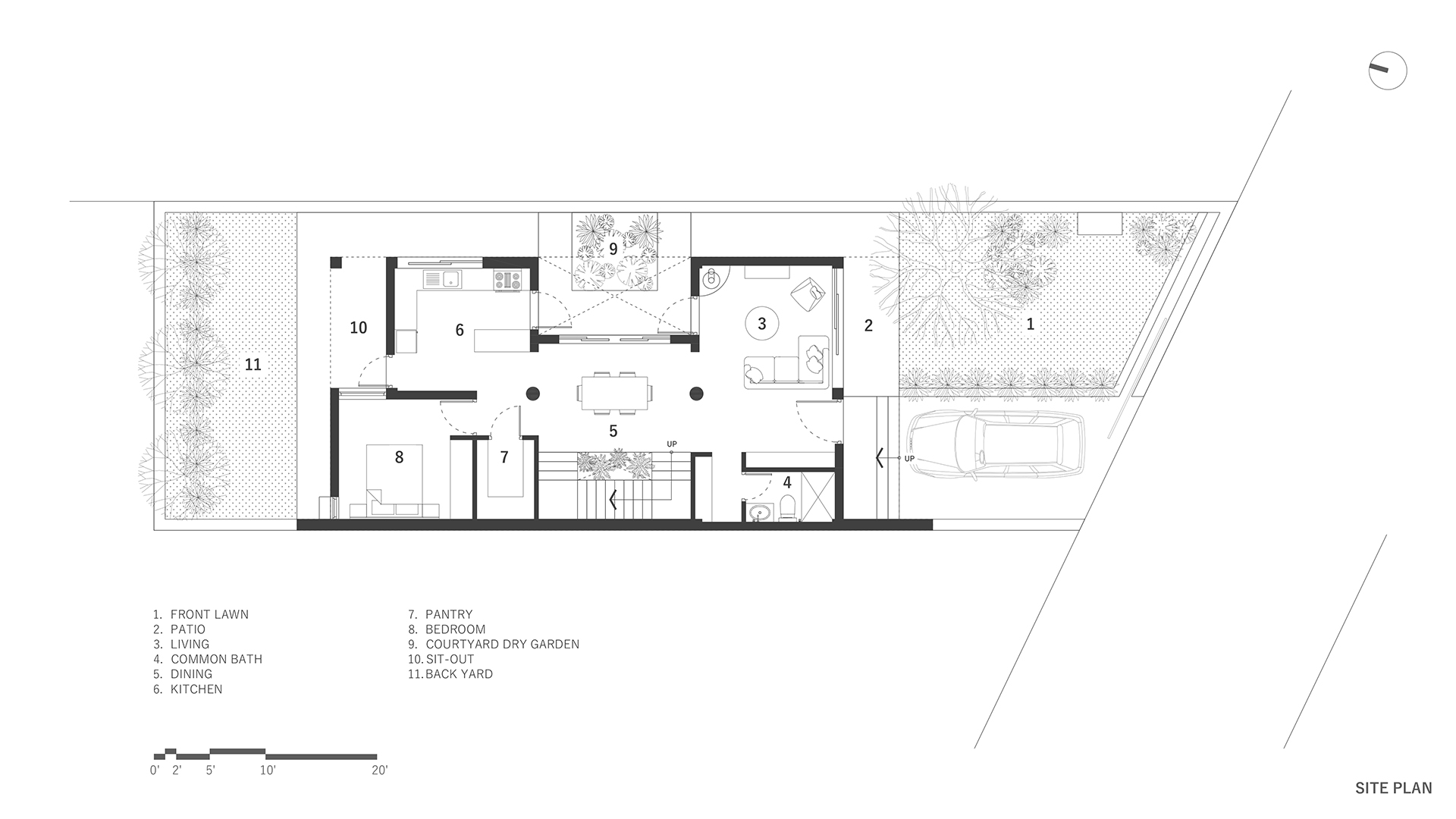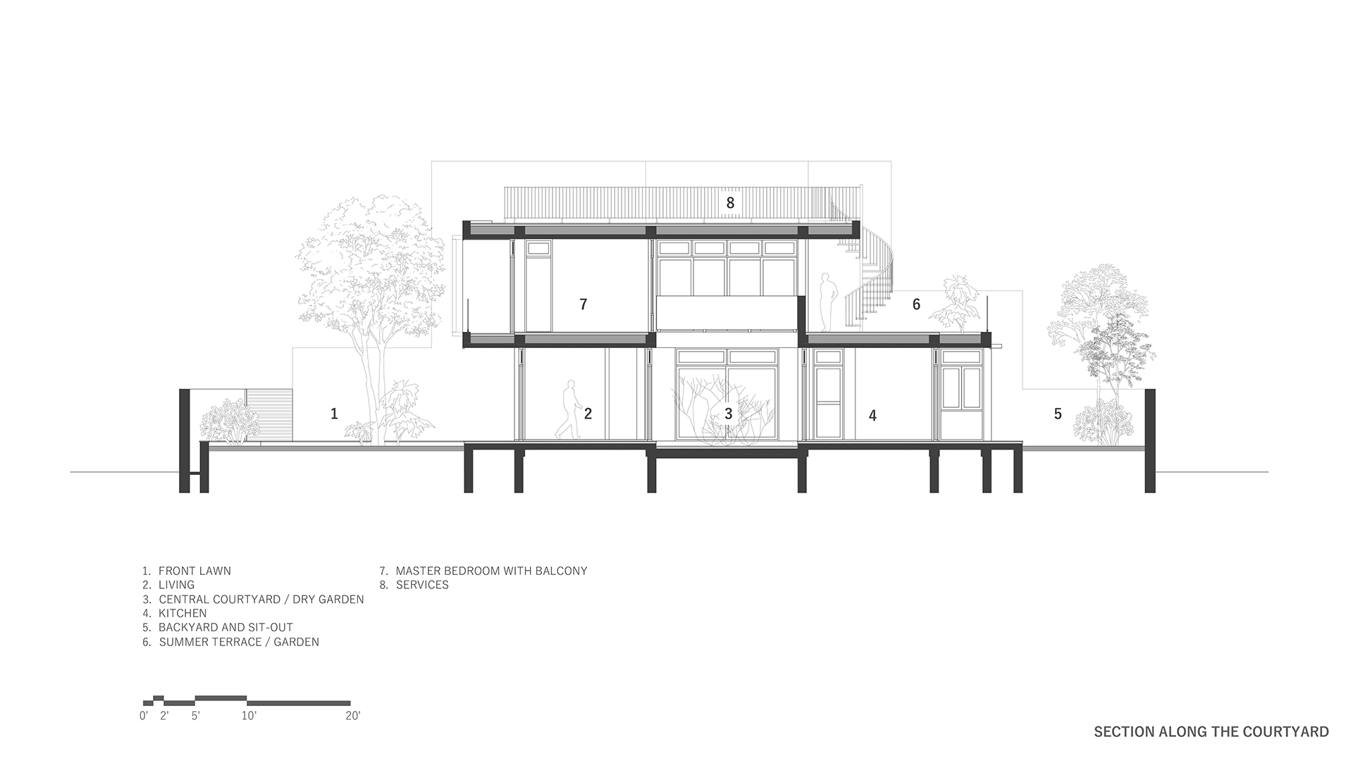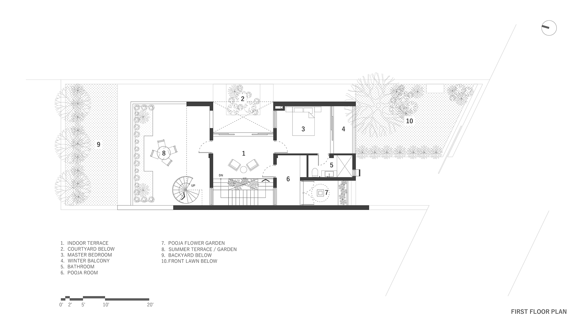 The key concept behind this two-storey tropical abode was to harness the overall architectural form, with the spatial arrangement centered around a courtyard garden to create its own microclimate. The central hub facilitates cross-ventilation, enabling every space of the structure to breathe while keeping the sun out; and effectively addressing the climatic adversities presented by the Terai region.
